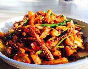 倒入鱿鱼须翻炒,加入老抽,烤肉酱,白糖翻炒