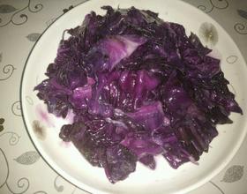 翻炒过程中分次加入少量清水(紫包菜含水量较少,为防止炒焦一定要适量加点清水),炒至菜八分熟,加盐调味即可