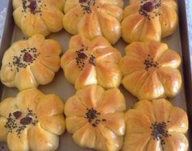 - 7. 整成圆形的,然后拿剪刀剪出喜欢的花瓣,放入烤箱启动第二次发酵20分钟,过后拿出来刷上蛋液,撒点芝麻和蔓莓装饰一下,再次放入烤箱120度25分钟,烤箱的温度根据自己的烤箱调,以免烤焦了