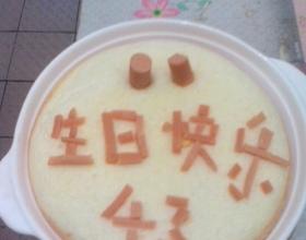 - 17. 香肠切成细条条,按字的模样放在蛋糕上即成