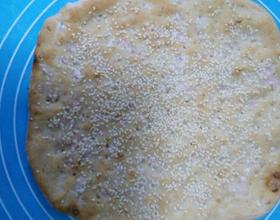 用牙签大头在中间插孔!用烘焙刷将洋葱水刷在饼面儿上,再撒上白芝麻!