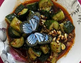 黄瓜盛在小盆里,蒜剁碎,撒点盐、花椒面、醋、味极鲜、香油、白糖和鸡精,辣椒油,拌均匀。