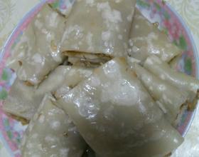把炒好的馅均匀摊在饼上,卷起来,用刀切成小块,就可以吃了(一定要趁热吃哦)