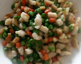 豌豆,胡萝卜快熟时,倒入鸡丁,加盐,生抽,糖,大火翻炒