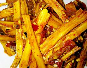 起锅入油与豆瓣酱一同加热,小火慢慢炒至油变红,在放入姜片,芝麻,树椒段,油温始终保持3-4成热,加牛肉粉,生抽,糖,料酒制成酱料,板筋一同翻炒。
