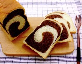 分别放入两个大碗发酵至2.5倍大。取出排气,松弛15分钟。分别擀成长方形面片。宽度比模具窄一些。可可面片压在原味面片上