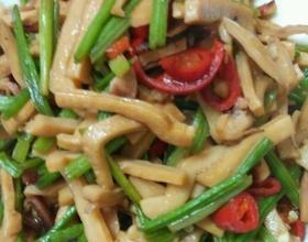 再加入香芹和辣椒一起翻炒两分钟,加入适量盐,我买的是淡水鱿鱼不带盐的,所以还和平常一样加盐炒
