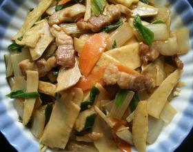 - 3. 当五花肉两面煸成金黄时,下冬笋片和青蒜白一起翻炒。