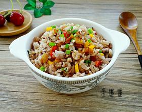 这里的米饭我用的是剩下的黑米饭,这个没有固定,白米饭黑米饭都可以。因为培根在煸炒的时候会下一些油,所以放油的时候注意一下用量。如果是给孩子吃,盐的用量稍微减少一些。