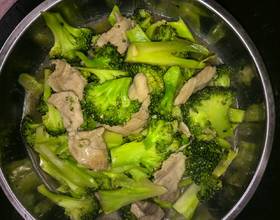 下油爆香蒜头后先炒西兰花再放肉炒,再放少量水煮