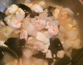 海带不容易熟,先和白菜多炖一会,虾仁和豆腐易熟,最后放入即可!