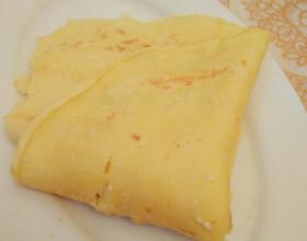 倒入一大勺蛋液,用少拿起锅,转一下,让蛋液均匀的摊开,煎2分钟,翻到另一变继续煎2分钟,小火