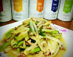 倒入萝卜丝炒一分钟,再把芥菜丝倒入一起翻炒,一分钟,放适量的盐,把肉丝倒入,最后把葱放入就可以啦