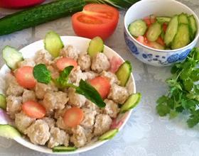团丸子之前将肉馅摔打几下,使其手感弹性十足。想做大点的丸子就用手团,小点的直接用虎口挤就可以了。丸子要冷水下锅,开水下锅会散的。