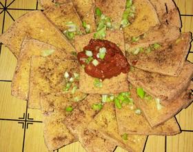4步把番茄辣椒酱放在炸好的豆腐上撒上葱花,吃的时候蘸酱吃就可以了
