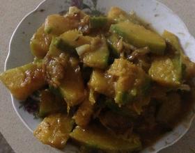 把切好的南瓜片放入油锅中,加水焖,水淹没过南瓜即可,开大火焖。