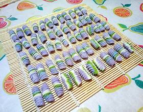 1.众所周知,紫甘蓝是天生的酸碱指示剂,酸和碱与其反应后,可呈现不同的颜色,我就是利用这个原理,把紫甘蓝汁变成三种颜色的,醋最好用白醋,那将会得到醇正的红色,我家里没有白醋,就用黑醋代替了,颜色差异不是很明显,我之前给儿子做实验时用过白醋,得到的红色特别漂亮2.和面团加盐是为了煮面时最大程度保留原色,减少褪色3.五个面团最好大小一致,这样切出来的彩色带才均匀4.边角料可以糅合擀成面条,也可以做成剂子包饺子