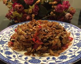 - 13. 再将萝卜皮倒入锅中翻炒,萝卜皮是用盐腌制的,所以不用放盐了,加入一勺豆瓣酱炒匀即可!