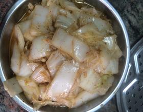 翻炒白菜、半熟、加盐、醋、辣椒面、鸡精
