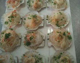 - 3. 用温水将粉丝泡软,泡好后捞出用冷水淋一下,再用香油、盐、蒜油、红椒末拌匀,然后将粉丝铺在扇贝壳里,再把扇贝肉放在粉丝上,搞好后将扇贝放到盘里。