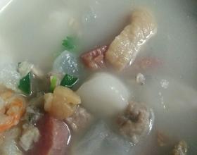 把鲮鱼下油锅炒干水份,再把鸡肉、瘦肉、腊鸭、腊肠下锅炒一下,接着放鱿鱼、虾米、元柱
