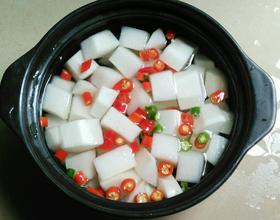 准备好材料,白萝卜一个,白醋一瓶,小辣椒五六个,白糖适量。