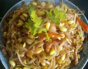 - 5. 放入豆芽倒入少许酱油,和少许花椒面辣椒,加入少许水在一起翻炒,盖上锅盖,闷四至五分钟,在简单翻炒
