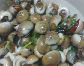 起锅,少许油,放入干红辣椒和葱段,炒香倒入小海螺,放糖少许醋,盐,味精加水焖至五分钟,放香菜关火出锅