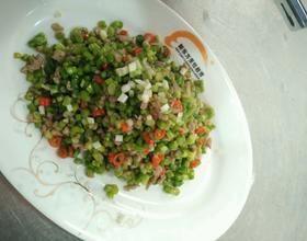 初加工:里脊肉切成小碎丁(用盐、料酒、水芡腌制),青红尖椒切末,蒜苔切碎丁,葱切葱花,姜蒜切末,
