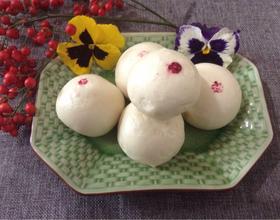 - 7. 用筷子头攒点红曲米粉点在奶黄包上面,是不是很好看呀,看连蝴蝶也抵不住诱惑,闻到香味赶过来了。