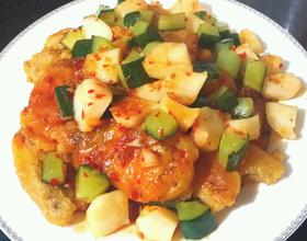 - 8. 把切好的黄瓜粒、马蹄粒倒入炒锅炒,加适量水和泰式酸辣酱、一勺白糖调汁,汁调好后淋入装盘的九肚鱼。