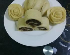 - 4. 把面揪一小块擀成小母指薄,把红豆馅放上捕匀,由一头卷起,卷成长条。再揪一块面分成几个小季子,擀皮,包肉馅成饺子彩。再擀六个皮排列起来,用筷子在中间压一下,取一小块面撮成长条,放在排列皮的一头卷起,在中间段开,就成玫瑰花珍。其余面加糖揉匀随意做发糕。