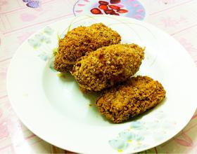 如图:将鸡翅,抹一道生粉,在过一下蛋清,最后在面包糠里滚一下,使鸡翅沾满面包糠