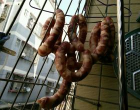 因为肠子我叫卖肉的帮弄好了,接下来可以灌肠了,找个矿泉水瓶把瓶口上端切下来,洗干净,将肠衣拿线绑实在瓶口上,就可以灌了。[因为一个人弄的,这一步没有拍照]成品图