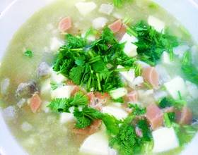 - 7. 水沸腾后放芋头.虾仁.火腿肠,待芋头差不多烂再放豆腐。中火15分钟左右