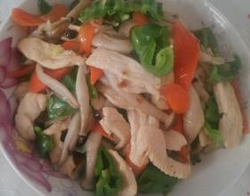 炒锅放入适量食用油烧至八成热时下去腌制好的鸡脯肉炒至断生,另起一锅倒油,八成热分别下入葱花,青椒,胡萝卜,断生后下入鸡肉蘑菇,调味后即可出锅