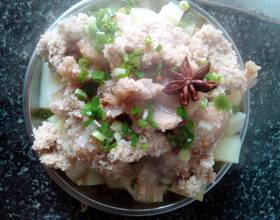 将肉洗净切片,放盐、蒸肉粉、花椒、八角拌匀,摆在土豆上面