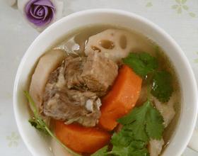 把泡好的绿豆,姜,胡萝卜,莲藕,排骨依次放入电饭锅,加水,煮2个小时。