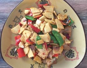 锅烧热后放入油,将肉片下锅炒干后放入豆瓣酱炒出香味,再把焯过水的原料放入锅中同炒至断生,用盐和味精调味即可出锅