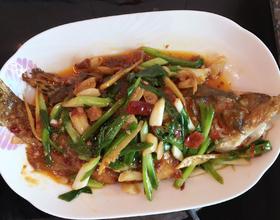 待锅内烧汁快干时把鱼小心的盛起装盘。把葱段放入锅中剩余的烧汁翻炒片刻起锅