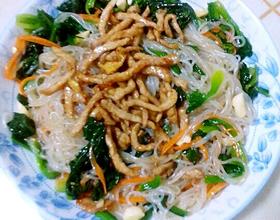 凉粉用水泡软后,再锅中煮熟,过冷水,备用。菠菜过水焯好备用。
