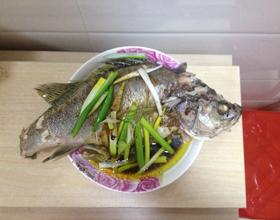 将盘中的水倒掉,再放些新鲜葱丝,起锅热油,待油熟,浇到鱼上,然后放入蒸鱼豉油即可。