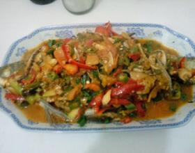 - 4. 然后锅里加油,把生姜大蒜放里面爆香。放几棵花椒。加入香菇 西红柿 辣椒翻炒。待西红柿出汁,加入调料。我就只放了鸡精加了点生抽。然后把他浇在鱼上面就好啦。??