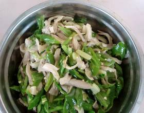 将菇下锅略收下汤汁,将配菜与菇加十三香.葱花翻炒均匀出锅