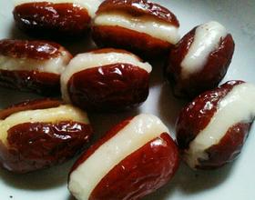 红枣泡在水里20分钟,糯米粉加热开水挪成团