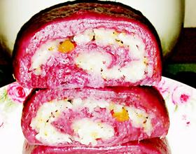 待紫薯面团发发酵好后,用擀面棍擀成片,加糯米饭铺满。