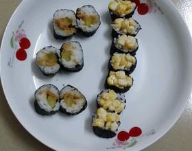 1.米饭推荐用隔夜米饭,因为米饭水分蒸发比较干且比较硬,容易成粒状,搅拌制作的过程都很方便,2.肉松寿司食材无能,因为准备的比较少,制作寿司可以有很多的食材,例如胡萝卜,青瓜炒鸡蛋火腿等,都是很好的寿司食材用料,另外,玉米寿司的做法,等同于海带寿司,喜欢海带寿司的朋友们,可以按照上述做法,到最后将玉米寿司取代为海带即可3.将饭放入紫菜中要记得头尾留一定的空间,因为我们在用帘子卷起来时候会挤压,这样做可以防止溢出