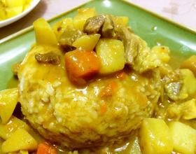 米饭盛放在碗里,压实,倒扣在盘子上,淋上足够的牛肉咖喱料;