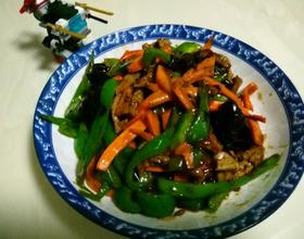 倒入肉丝,胡萝卜,柿子椒翻炒