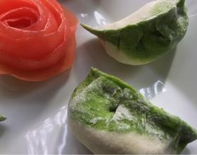 - 1. 用菠菜汁和成一团绿色面,用温水和成一团白色面。将绿面团搓成一个长的圆形,再用擀面杖将绿面团擀扁,上面用手涂上一层水,将白面团放在上面丶用绿面团包住白面团